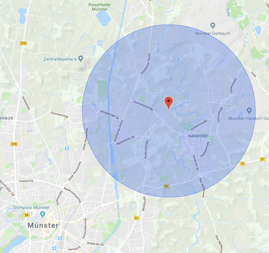 Honigbienen tragen Nektar und Pollen in einem Radius von bis zu 3 Kilometern um den Bienenstand ein. Die Grafik zeigt, welche Bereiche dabei erreicht werden könnten. Unsere Bienen müssen aber nicht so weit fliegen. Während der aktiven Zeit finden sie ausreichend Nahrung verschiedener Trachtpflanzen in der Nähe.