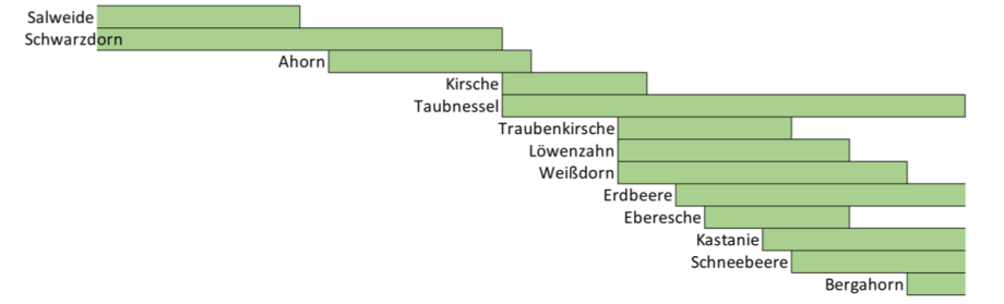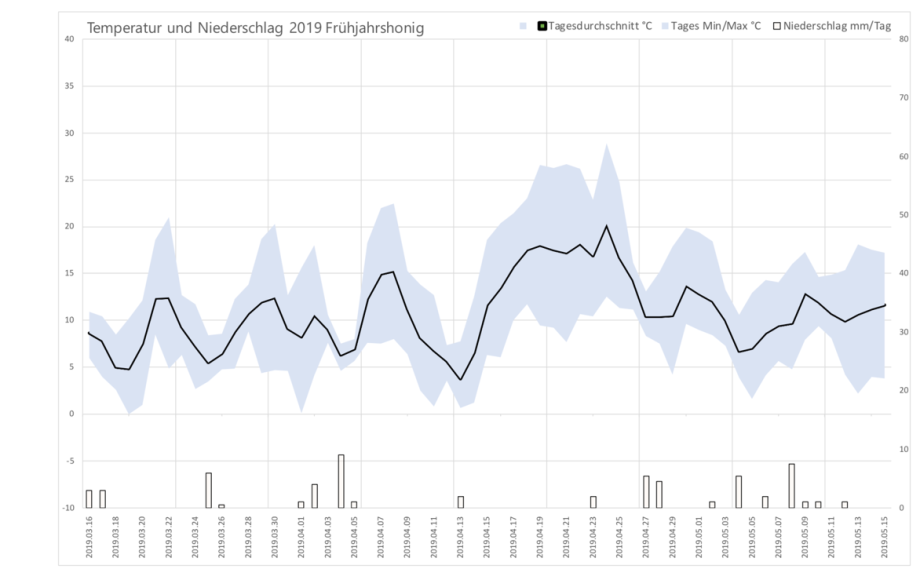 Unten seht ihr den Temperatur- und Niederschlagsverlauf während des Eintrags des Frühjahrshonigs. Es handelt sich um eigene Messungen an unserem Standort in Sudmühle. Darüber hinaus sind in einem Blühkalender die wichtigen Trachtpflanzen dargestellt.